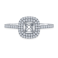 A symphony of elegance awaits your hand in this expertly crafted prong set diamond engagement ring. The cushion cut center stone gives the ring vintage appeal while the double halo of glittering diamonds captures the style of today. The cathedral silhouette is encrusted with diamonds that gleam from their secure 14K white gold settings.