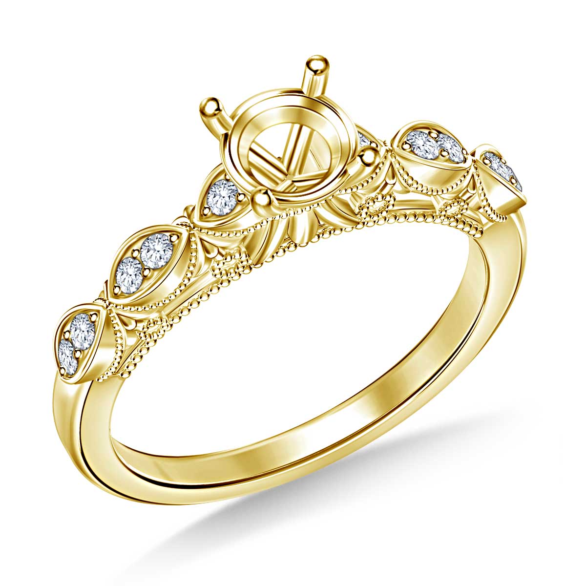Resplendent arched details create a romantic effect in this vintage inspired diamond engagement ring. Pave set diamonds sparkle from within marquise shaped frames. The ring is designed to fit the brilliant center diamond of your choice. Delicate beading creates an intricate gallery beneath the setting, filling in the open space with beauty.