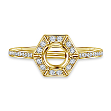 The exciting geometry of this innovative design combines the popular diamond halo with a hexagonal shape. Crips angles and clean lines bring a fresh and unique look to this expertly crafted 18K yellow gold engagement ring which surrounds your center stone with diamonds. Original and stylish, this ring has a cathedral profile and a mirror finish.