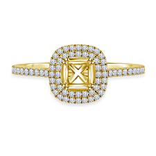 | Cushion Cut Double Halo Cathedral Diamond Engagement Ring with Curved Diamond Matching Band in 18K Yellow Gold | |
