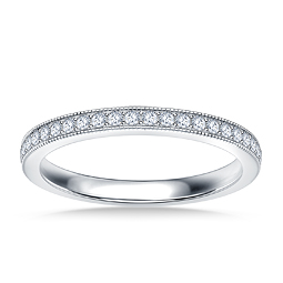 Elegant and classic, this petite wedding band features brilliant diamonds in secure pave setting. Migraine edges adds an appealing texture making it look slender. The design snugly nests against your engagement ring.
