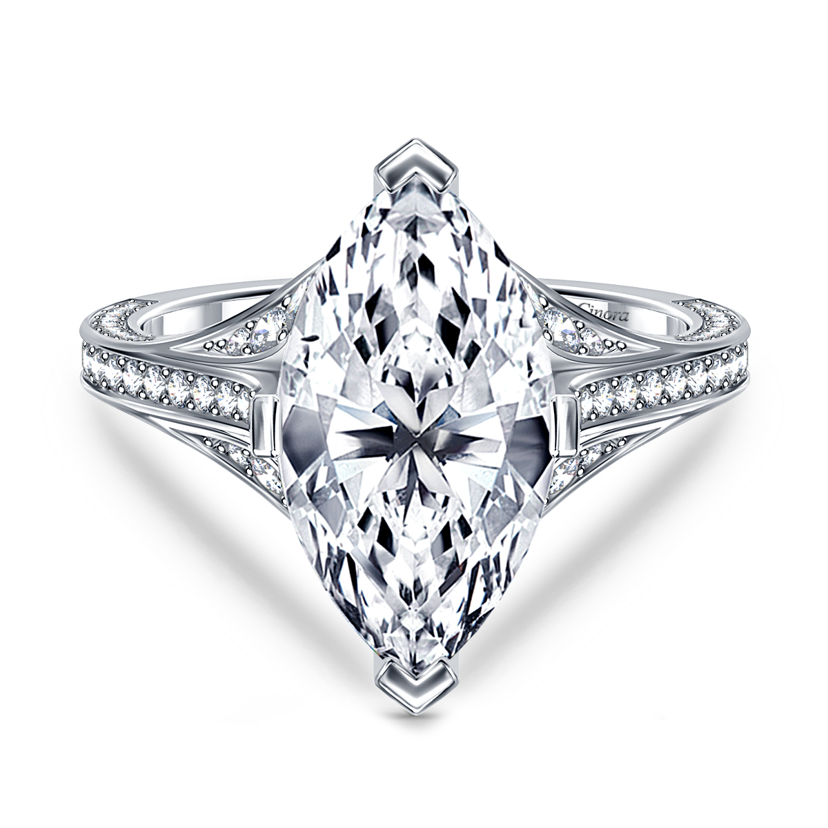 Nestled in a glittering diamond embrace, the design of this exquisite diamond engagement ring features a beautifully framed center diamond framed between a V shaped diamond channel. A twisted knot pattern below the center stone creates an elegant effect while the brightly polished cathedral shank enlivens the scintillating diamonds.