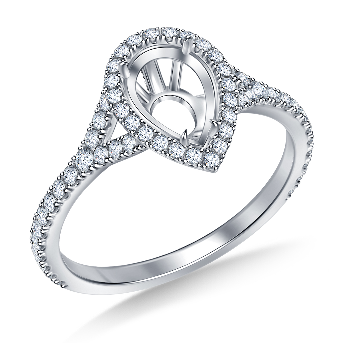 | Fancy Cathedral Pear Shape Diamond Engagement Ring with Split Shank and Diamond Halo in Platinum | |