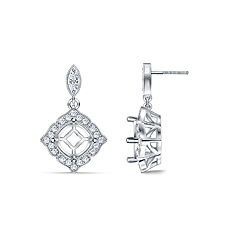 The vintage charm of this diamond halo engagement ring is exemplified by the ornate design. Adorned with accent diamonds snuggled inside of meticulously crafted marquise shapes, the band has a delightful sparkle that compliments the center setting. An intricate frame of diamonds sets off your center diamond while milgrain details add an attractive texture.