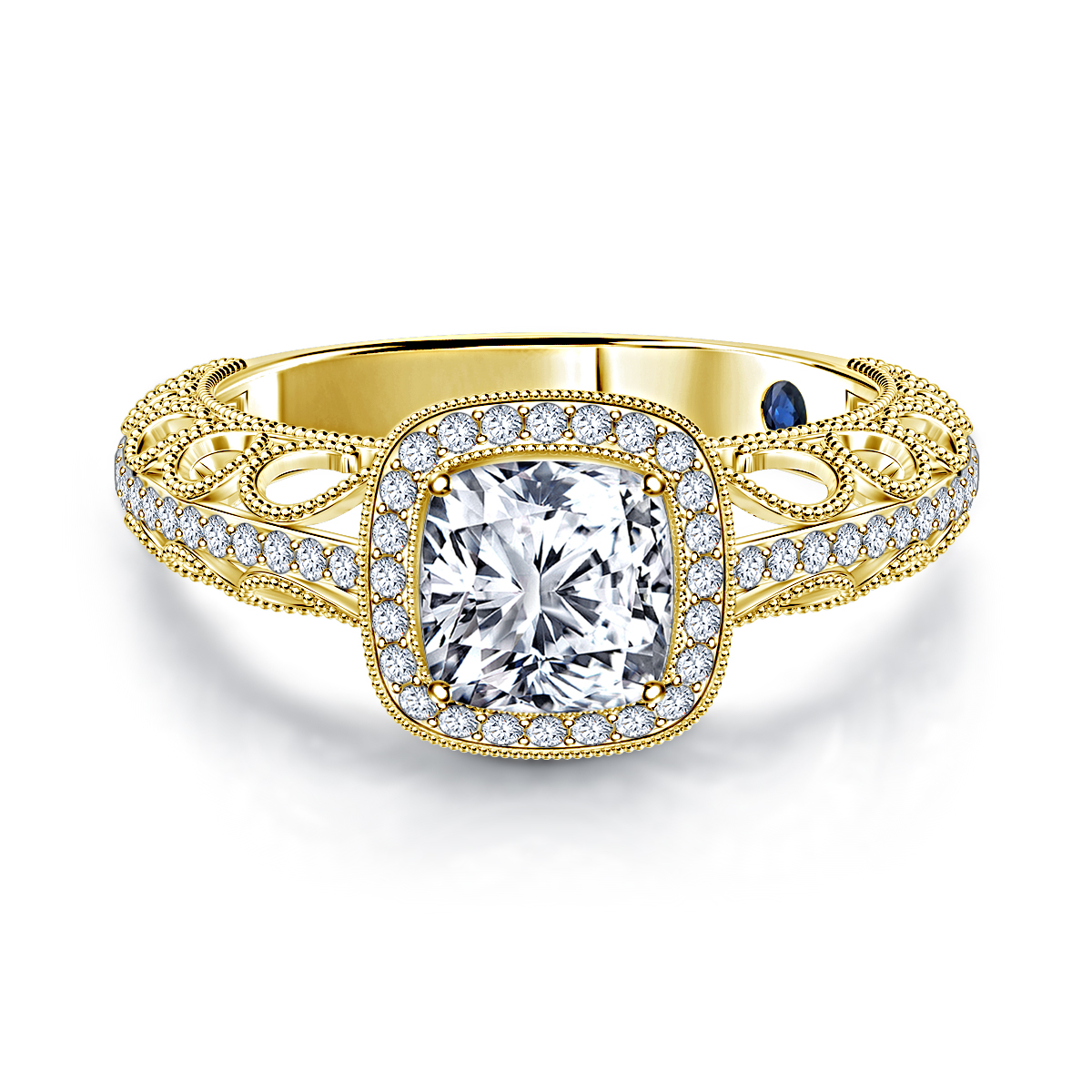 This graceful cushion halo diamond engagement ring epitomizes vintage beauty and elegance. Delicate miligrained scrolls take center stage while a soaring cathedral profile perfectly complements this vintage-inspired design. Adding fire and life to this ring are glittering pave set rows of diamonds on its shank.
