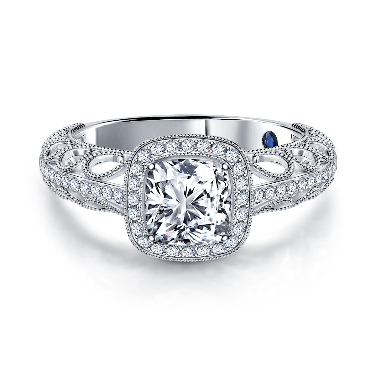 This graceful cushion halo diamond engagement ring epitomizes vintage beauty and elegance. Delicate miligrained scrolls take center stage while a soaring cathedral profile perfectly complements this vintage-inspired design. Adding fire and life to this ring are glittering pave set rows of diamonds on its shank.