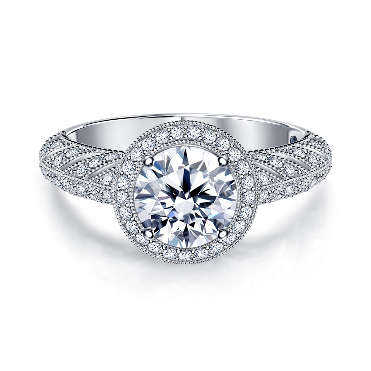 This fancy halo engagement ring with an oval center absolutely dazzles on first sight. It’s an art deco-inspired design with classical details like soaring cathedral silhouette and miligraining on edges. But it's an exquisitely crafted paisley shaped border that takes center stage, creating a striking focal point on this ring.