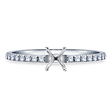 This stunning engagement ring setting can accommodate a range of center stone selections. Split prong settings highlight the glittering round diamonds set along the ring shank while a secure four prong setting showcases your center stone for maximum brilliance.