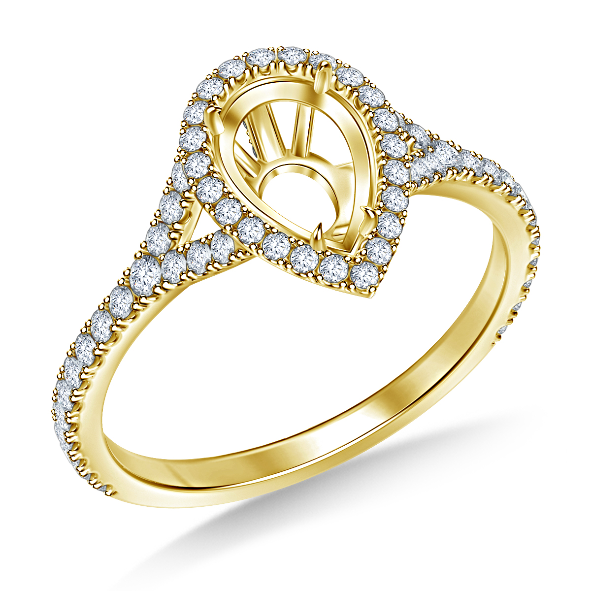 Dramatic and bold, this fancy pear shape diamond engagement ring features a cathedral silhouette encrusted with glittering diamonds. A stunning diamond halo surrounds the center setting and tucked away underneath is a sparkling diamond set basket below the center. Graceful and elegant, the split shank motif is also fresh and modern.