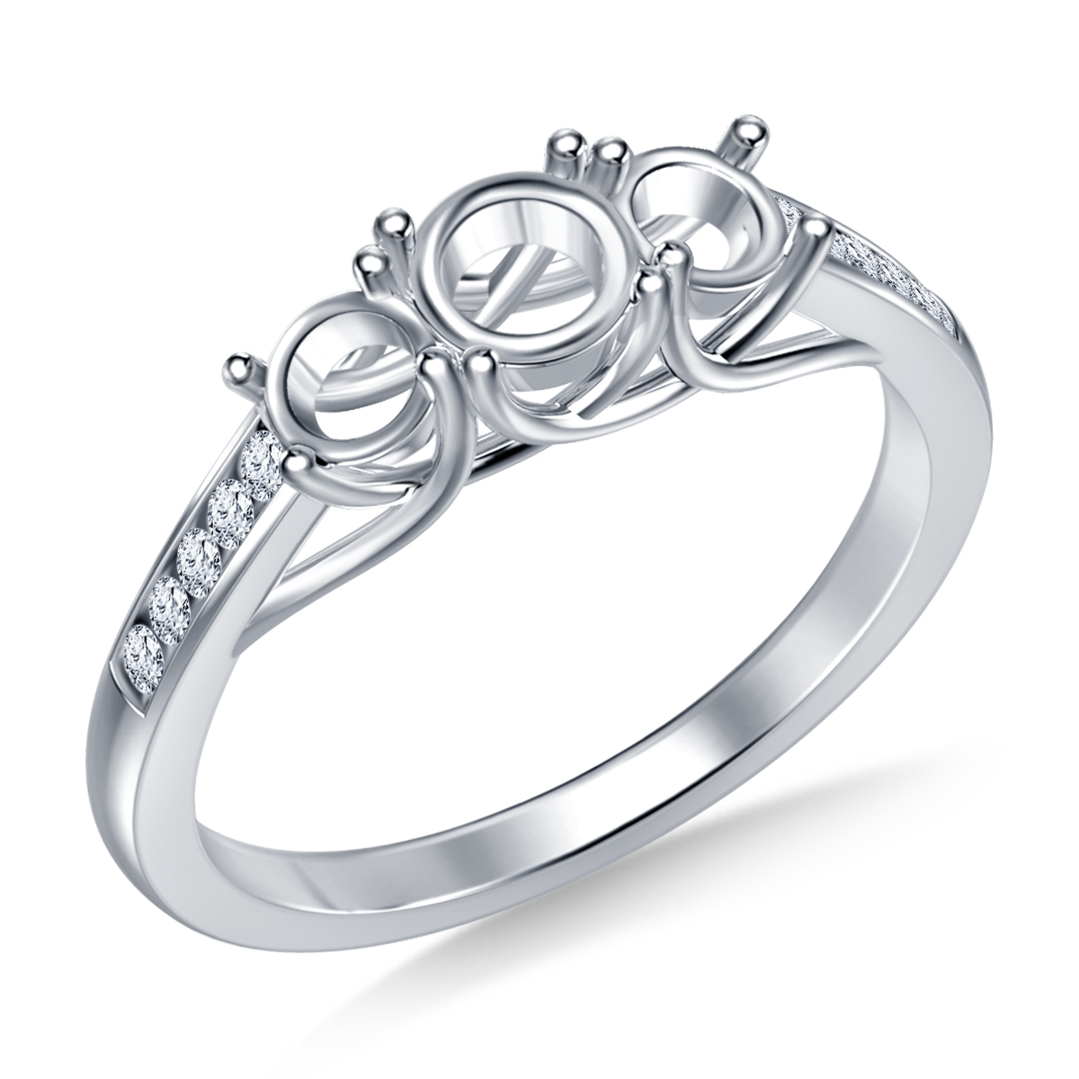 The classic three stone trellis ring gets a dazzling new design in our unique channel set engagement ring. Three secure four prong settings pay homage to the stones you choose to represent your past, present, and future, while a row of glittering channel set diamonds brings a lively accent to the center trio.