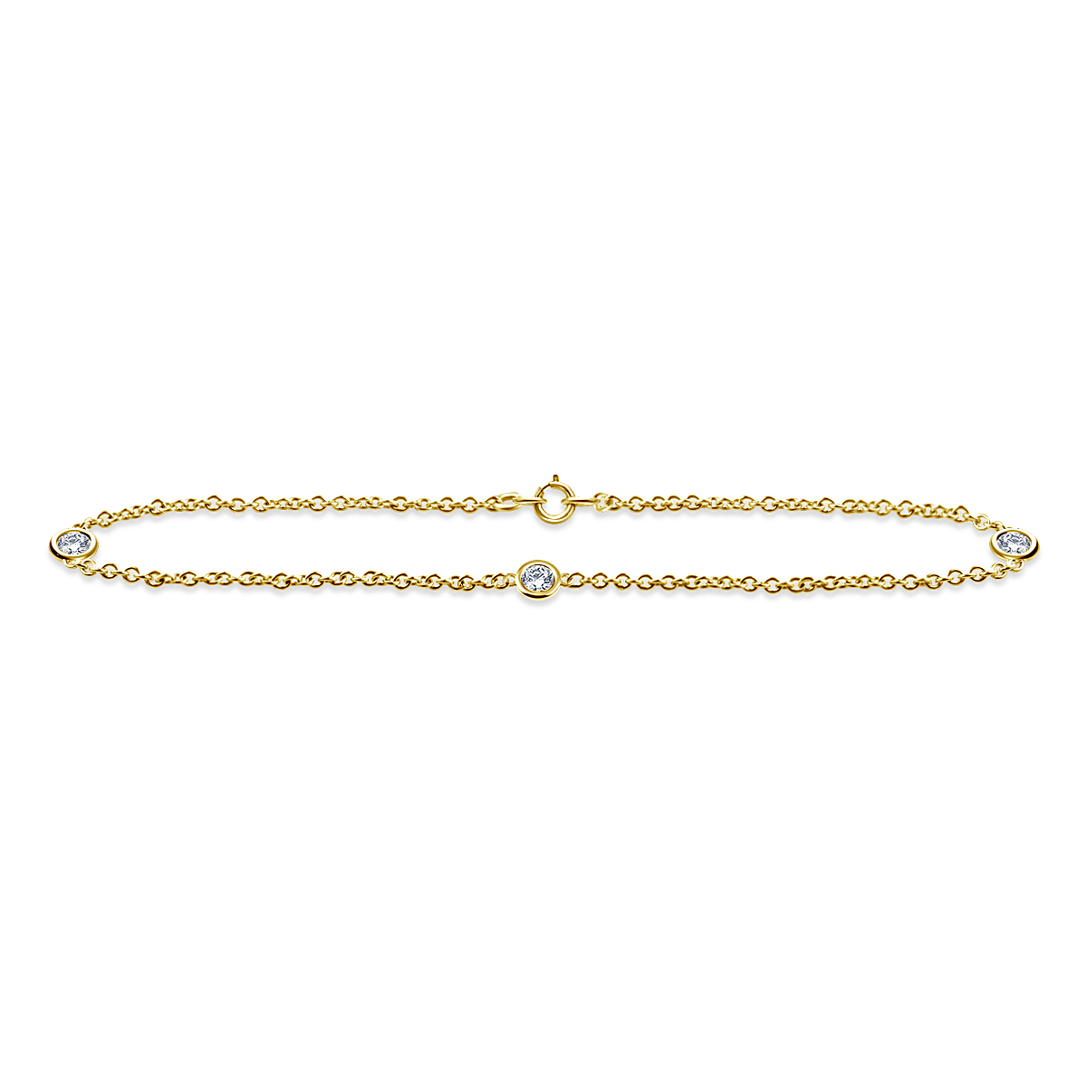 Three brilliant diamonds set in the style of the popular bezel set station motif delight the eye in this expertly crafted bracelet. Brightly polished 14K rose gold provides a gleaming backdrop for the sparkling diamonds that glitter along the slender cable chain. A spring ring clasp keeps the bracelet secure.