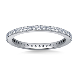 This eternity ring is crafted in 14K white gold and is studded with a continous stream of prong set 0.01 ct round diamonds all the way around the band. Total carat weight will vary depending on the ring size.