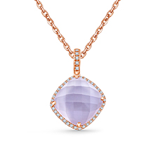 The blush of pink displays beautifully in this checkerboard faceted cushion cut rose quartz. The stone most often associated with love, the delicate shade of pink glows from within the warm embrace of 14K rose gold in this expertly crafted pendant. Surrounding by a glittering frame of prong set diamonds, this stylish pendant delights the heart.
