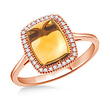 The smooth sugarloaf cut of this enchanting citrine brings soft elegance to the graceful simplicity of the design. A glittering halo of pave set round diamonds provides a lively accent to the prong set cabochon center stone. Expertly crafted in 14K rose gold, this ring is a tasteful and sophisticated addition to your jewelry collection.