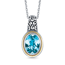 The intense and bright color of an oval blue topaz commands attention in this beautifully crafted sterling silver and 18K yellow gold ring. The blue topaz is securely set within the 18K gold bezel which is expertly textured with milgrain edging. The ring design boasts intricate details of graceful scrollwork and playful swirls.