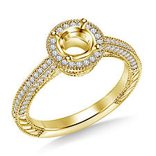Encrusted with diamonds, this matching wedding band sparkles from every angle. The curved design allows the wedding band to stack neatly against your engagement ring. Milgrain edges add an alluring texture while intricate engraving adds a romantic touch. Pave diamonds on the top and sides create a scintillating effect.
