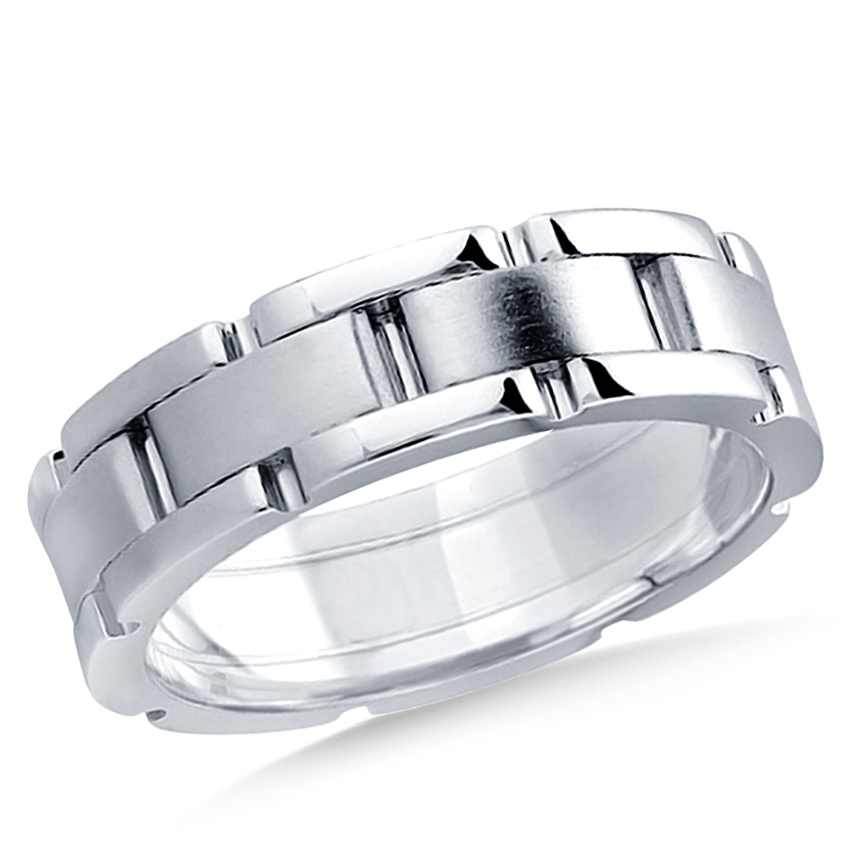 This 8 mm wide band features an eye-catching grooved pattern that adds depth and dimension. The sleek squared edges complete the design. A look he’ll treasure, with this high polished band.