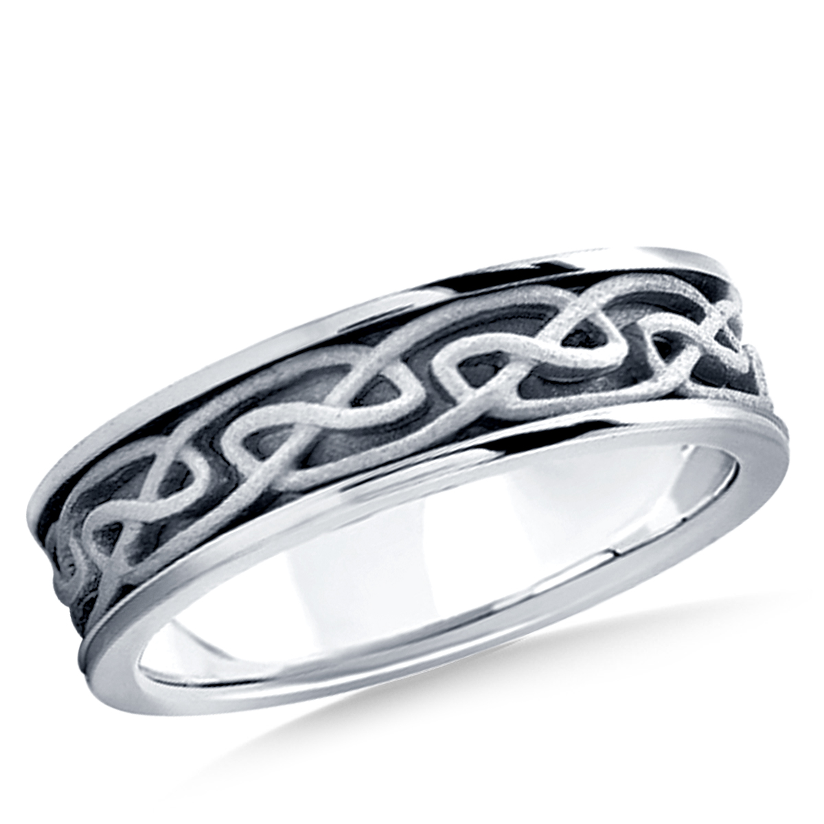 This handsome 6 mm 14k white gold ring for him features a bright polished finish and an intertwined celtic knot inlay encircling the band.