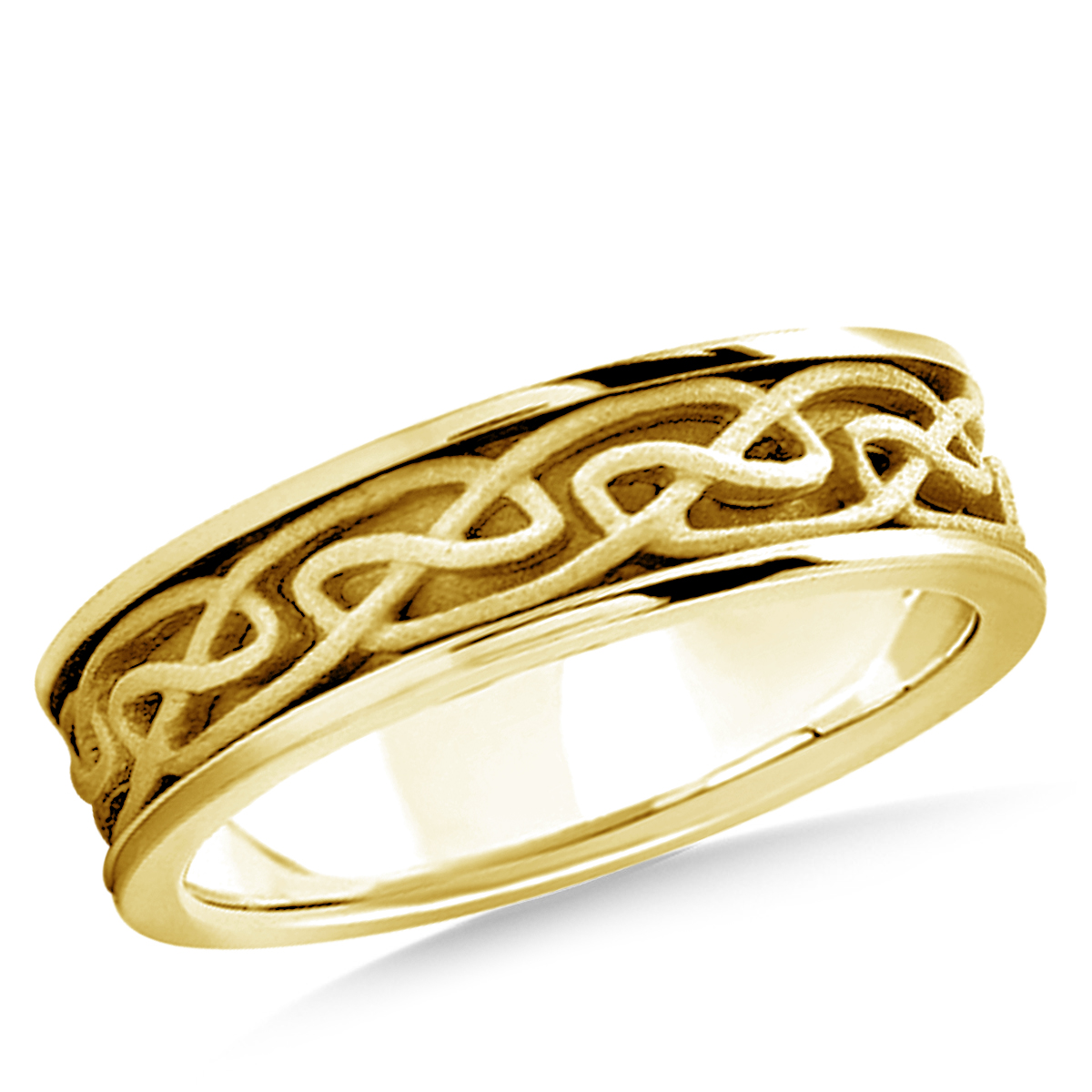This handsome 6 mm 14k yellow gold ring for him features a bright polished finish and an intertwined celtic knot inlay encircling the band.