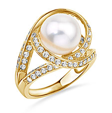 smoky and mysterious with hints of iridescence, this generous pearl ring makes a stunning fashion statement. The gray pearl is wrapped with glittering white topaz accent gemstones in a graceful silver ring plated with rhodium for lasting luster.