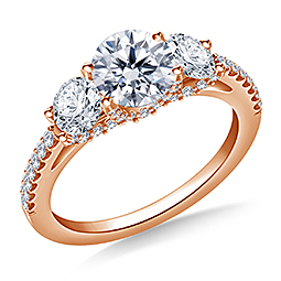 symbolizing the past, present, and future, this three stone diamond engagement ring has a cathedral silhouette and a diamond encrusted shank. Expertly crafted in 14K rose gold, the center diamond is highlighted by two side companion diamonds, each securely set with individual prong settings. The timeless design is elegant and attractive.