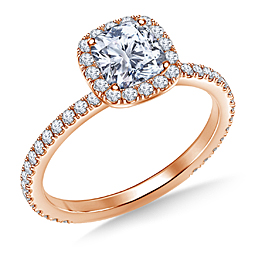 If it is a vintage look that you are after, this beautiful diamond encrusted engagement ring is a match made in heaven. The antique appeal of the cushion cut takes center stage as a glittering halo of fine diamonds surrounds the fancy shape cushion cut center diamond. Expertly crafted in 14K rose gold, prong settings keep the diamond secure.
